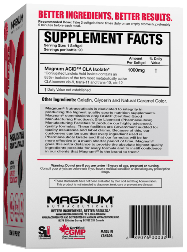 Magnum acid - это добавка на основе конъюгированной линолевой кислоты (CLA), которая больше всего содержится в мясе травоядных животных и молочных продуктах. Организм человека не способен вырабатывать линолевую кислоту, поэтому ее необходимо получать с пищей. Одна капсула MAGNUM ACID содержит столько же CLA, сколько 6 литров молока!
