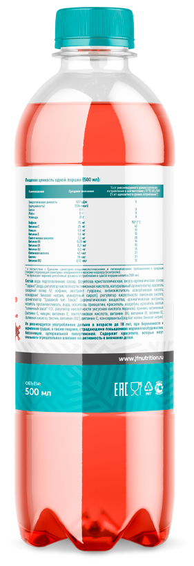 подготовленная питьевая вода, экстракт гуараны, подсластитель - "Мультисвист Фрут В" (фруктоза, Е951), регулятор кислотности - лимонная кислота Е330, загуститель - КМЦ Е466, ароматизатор - "Малина", "Клубника", экстракт родиолы розовой, экстракт лимонника, подсластители:сукралоза Е955, "Аспасвит К" (Е952, Е954,Е950), экстракт стевии, консерванты: сорбат калия Е202, бензонат натрия Е211, краситель - кармуазин Е122.