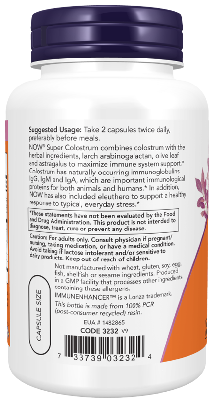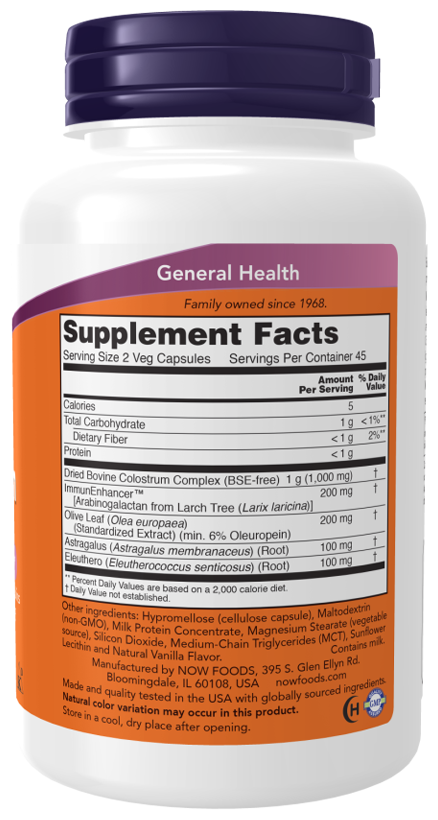 Super Colostrum от NOW сочетает в себе молозиво с растительными ингредиентами, арабиногалактаном лиственницы, листьями оливкового дерева и астрагалом для максимальной поддержки иммунной системы. Молозиво содержит природные иммуноглобулины IgG, IgM и IgA, которые являются важными иммунологическими белками как для животных, так и для человека. Кроме того, молозиво от NOW содержит элеутерококк для поддержки здоровой реакции на типичные повседневные стрессы.