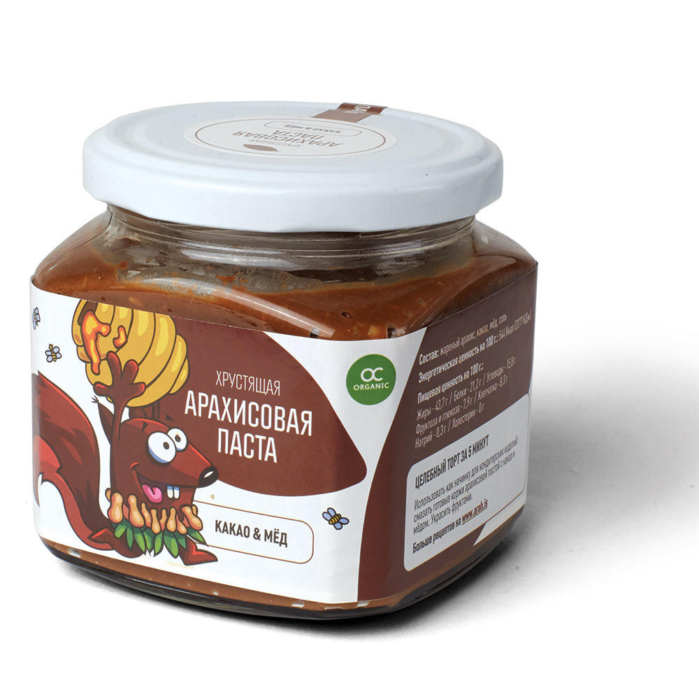 Хрустящая арахисовая паста с мёдом и какао – более мягкая консистенция с вкраплениями кусочков жаренного арахиса. Мёд и какао добавляют пасте вкуса и сладости.