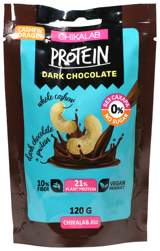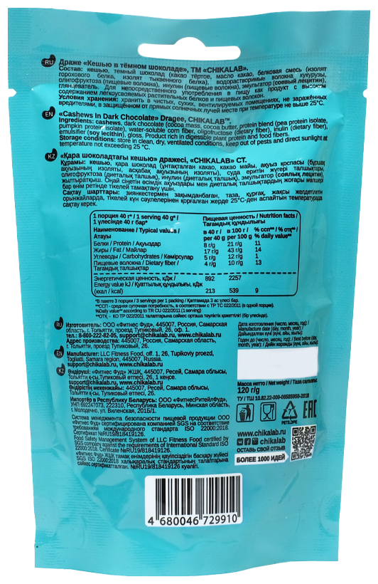 | кешью, темный шоколад (какао тёртое, масло какао, белковая смесь (изолят горохового белка, изолят тыквенного белка), водорастворимые волокна кукурузы, олигофруктоза (пищевые волокна), инулин (пищевые волокна), эмульгатор (соевый лецитин), глянцеватель. | ||